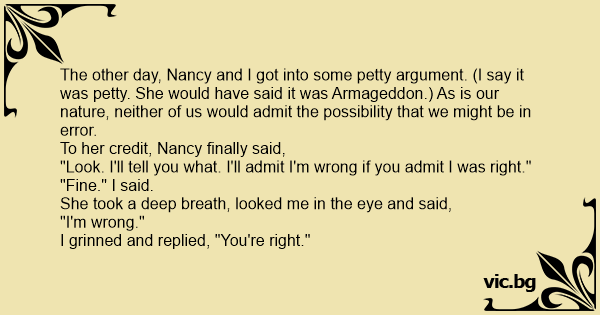 The other day, Nancy and I got into some petty argument. (I say it was petty. She would have said it was Armageddon.) As is our nature, neither of us would admit the possibility that we might be in error.