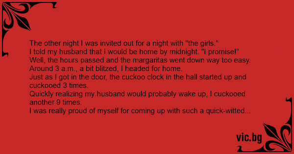 When I asked him why, he said, "Well, last night our clock cuckooed 3 times, then said, "Oh, сrар," cuckooed 4 more times, cleared its throat, cuckooed another 3 times, giggled, cuckooed twice more, and then tripped over the cat and farted."