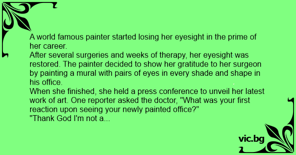 When she finished, she held a press conference to unveil her latest work of art. One reporter asked the doctor, "What was your first reaction upon seeing your newly painted office?"