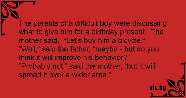 The parents of a difficult boy were discussing what to give him for a birthday present. The mother said, “Let’s buy him a bicycle.” “Well,” said the father, “maybe - but do you think it will improve his behavior?” “Probably not,” said the mother, “but it will spread it over a wider area.”