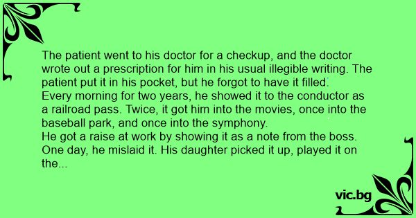 The patient went to his doctor for a checkup, and the doctor wrote out a prescription for him in his usual illegible writing. The patient put it in his pocket, but he forgot to have it filled.
