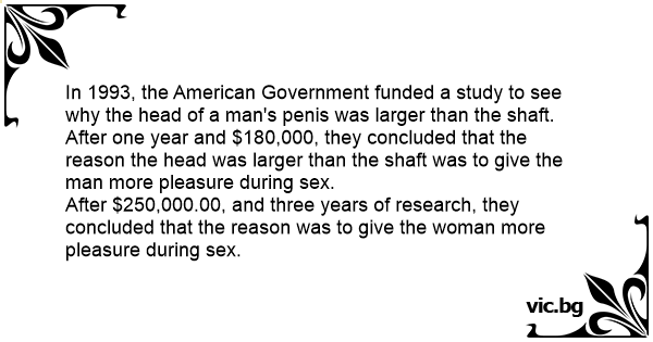 In 1993, the American Government funded a study to see why the head of a man's реnis was larger than the shaft. After one year and $180,000, they concluded that the reason the head was larger than the shaft was to give the man more pleasure during sеx.