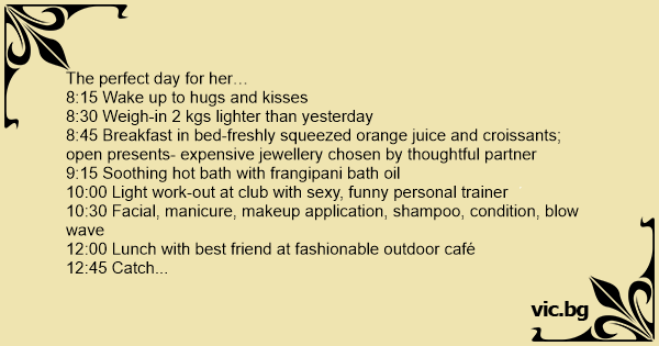 8:45 Breakfast in bed-freshly squeezed orange juice and croissants; open presents- expensive jewellery chosen by thoughtful partner