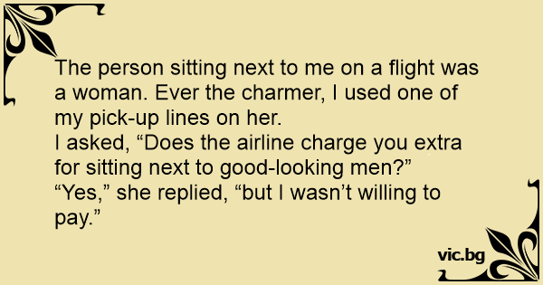The person sitting next to me on a flight was a woman. Ever the charmer, I used one of my pick-up lines on her.