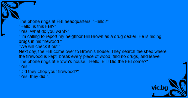 Next day, the FBI come over to Brown's house. They search the shed where the firewood is kept, break every piece of wood, find no drugs, and leave. The phone rings at Brown's house. "Hello, Bill! Did the FBI come?"