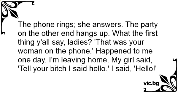 The phone rings; she answers. The party on the other end hangs up. What the first thing y'all say, ladies? 'That was your woman on the phone.' Happened to me one day. I'm leaving home. My girl said, 'Tell your вiтсh I said hello.' I said, 'Hello!'
