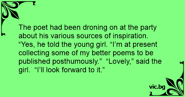 The poet had been droning on at the party about his various sources of inspiration. “Yes, he told the young girl. “I’m at present collecting some of my better poems to be published posthumously.” “Lovely,” said the girl. “I’ll look forward to it.”