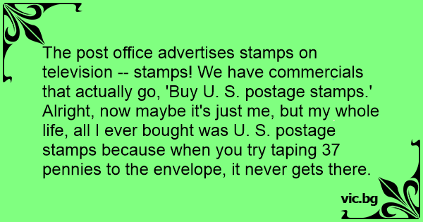 The post office advertises stamps on television -- stamps! We have commercials that actually go, 'Buy U. S. postage stamps.' Alright, now maybe it's just me, but my whole life, all I ever bought was U. S. postage stamps because when you try taping 37 pennies to the envelope, it never gets there.