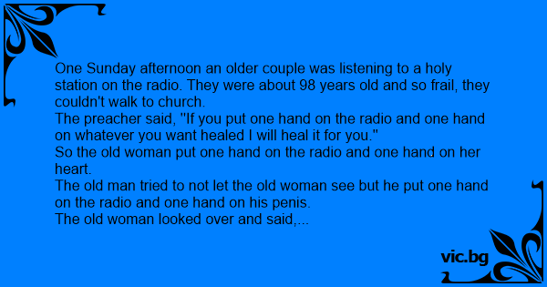 One Sunday afternoon an older couple was listening to a holy station on the radio. They were about 98 years old and so frail, they couldn't walk to church.