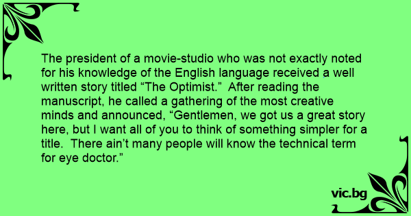 The president of a movie-studio who was not exactly noted for his knowledge of the English language received a well written story titled “The Optimist.” After reading the manuscript, he called a gathering of the most creative minds and announced, “Gentlemen, we got us a great story here, but I want all of you to think of something simpler for a title. There ain’t many people will know the technical term for eye doctor.”