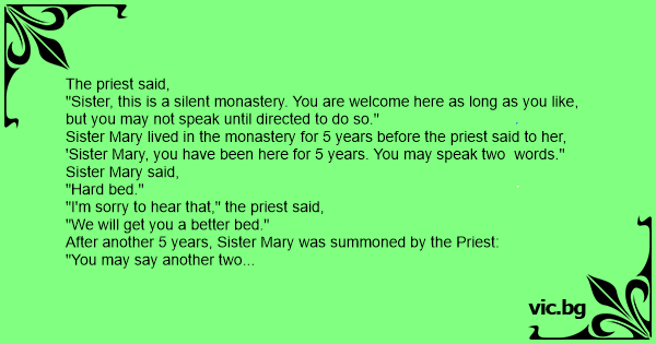 Sister Mary lived in the monastery for 5 years before the priest said to her, 'Sister Mary, you have been here for 5 years. You may speak two words."