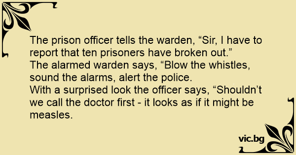 The prison officer tells the warden, “Sir, I have to report that ten prisoners have broken out.”