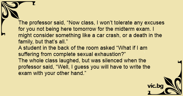 The professor said, “Now class, I won’t tolerate any excuses for you not being here tomorrow for the midterm exam. I might consider something like a car crash, or a death in the family, but that’s all.”