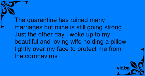 The quarantine has ruined many marriages but mine is still going strong.<br />Just the other day I woke up to my beautiful and loving wife holding a pillow tightly over my face to protect me from the coronavirus.