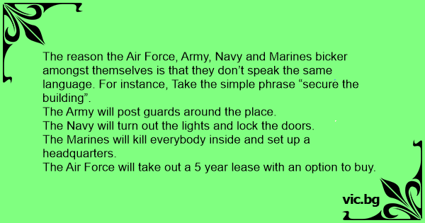 The reason the Air Force, Army, Navy and Marines bicker amongst themselves is that they don’t speak the same language. For instance, Take the simple phrase “secure the building”.