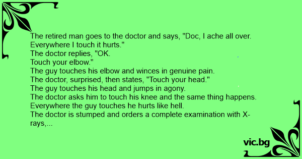 A man goes to the doctor and says, "Doctor, wherever I touch, it hurts." The doctor asks, "What do you mean?" The man says, "When I touch my shoulder, it really hurts. If I touch my knee - OUCH!...