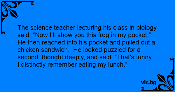 The science teacher lecturing his class in biology said, “Now I’ll show you this frog in my pocket.” He then reached into his pocket and pulled out a chicken sandwich. He looked puzzled for a second, thought deeply, and said, “That’s funny. I distinctly remember eating my lunch.”