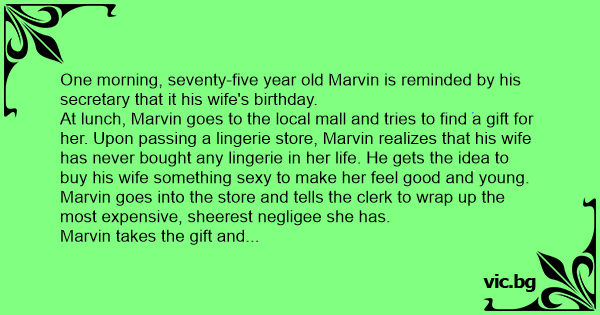 At lunch, Marvin goes to the local mall and tries to find a gift for her. Upon passing a lingerie store, Marvin realizes that his wife has never bought any lingerie in her life. He gets the idea to buy his wife something sеxy to make her feel good and young. Marvin goes into the store and tells the clerk to wrap up the most expensive, sheerest negligee she has.
