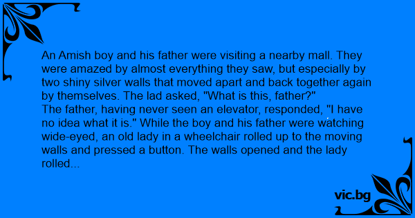 An Amish boy and his father were visiting a nearby mall. They were amazed by almost everything they saw, but especially by two shiny silver walls that moved apart and back together again by themselves. The lad asked, "What is this, father?"