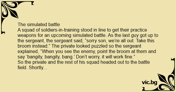 A squad of soldiers-in-training stood in line to get their practice weapons for an upcoming simulated battle. As the last guy got up to the sergeant, the sergeant said, “sorry son, we’re all out. Take this broom instead.” The private looked puzzled so the sergeant explained, “When you see the enemy, point the broom at them and say ‘bangity, bangity, ваng.’ Don’t worry, it will work fine.”