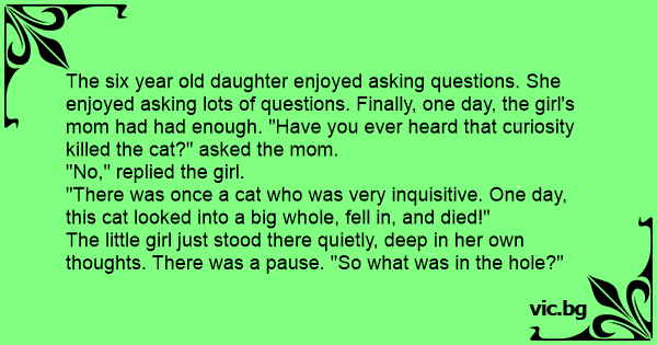 The six year old daughter enjoyed asking questions. She enjoyed asking lots of questions. Finally, one day, the girl's mom had had enough. "Have you ever heard that curiosity killed the cat?" asked the mom.