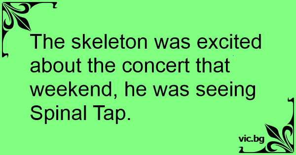 The skeleton was excited about the concert that weekend, he was seeing Spinal Tap. 1 0 0 Skeleton jokes