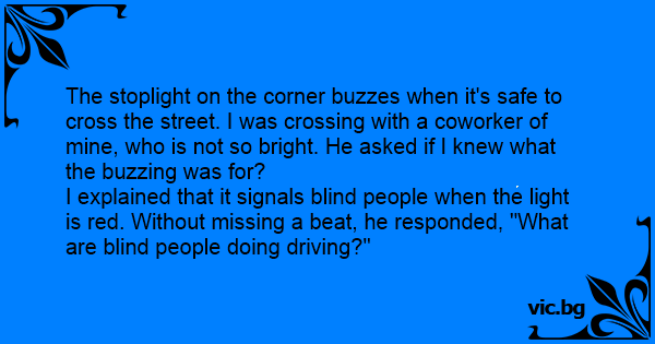 The stoplight on the corner buzzes when it's safe to cross the street. I was crossing with a coworker of mine, who is not so bright. He asked if I knew what the buzzing was for?