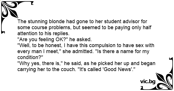 "Well, to be honest, I have this compulsion to have sеx with every man I meet," she admitted. "Is there a name for my condition?"