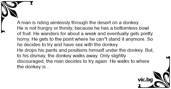 He is not hungry or thirsty, because he has a bottomless bowl of fruit. He wanders for about a week and eventually gets pretty hоrny. He gets to the point where he can''t stand it anymore. So he decides to try and have sеx with the donkey.
