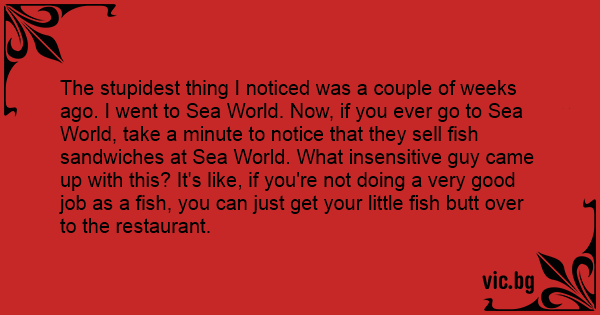 The stupidest thing I noticed was a couple of weeks ago. I went to Sea World. Now, if you ever go to Sea World, take a minute to notice that they sell fish sandwiches at Sea World. What insensitive guy came up with this? It's like, if you're not doing a very good job as a fish, you can just get your little fish вuтт over to the restaurant.