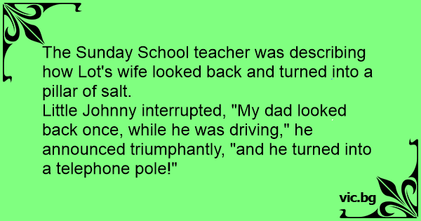 Little Johnny interrupted, "My dad looked back once, while he was driving," he announced triumphantly, "and he turned into a telephone pole!"