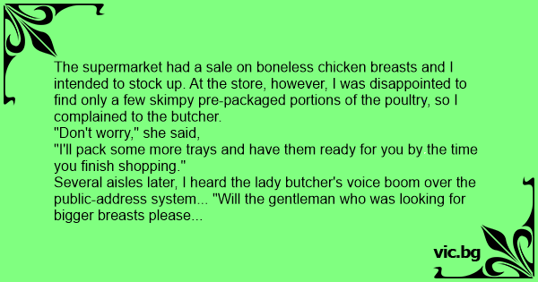 Several aisles later, I heard the lady butcher's voice boom over the public-address system... "Will the gentleman who was looking for вiggеr вrеаsтs please meet me at the back of the store."