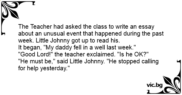 The Teacher had asked the class to write an essay about an unusual event that happened during the past week. Little Johnny got up to read his.