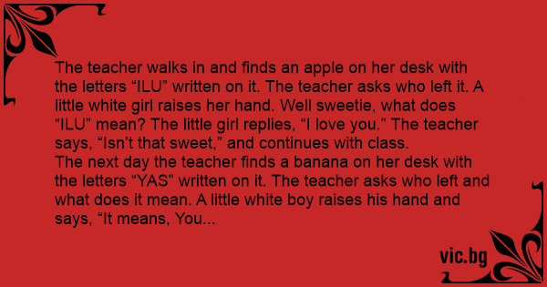The teacher walks in and finds an apple on her desk with the letters “ILU” written on it. The teacher asks who left it. A little white girl raises her hand. Well sweetie, what does “ILU” mean? The little girl replies, “I love you.” The teacher says, “Isn’t that sweet,” and continues with class.