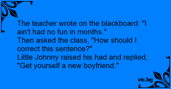 The teacher wrote on the blackboard: "I ain't had no fun in months."