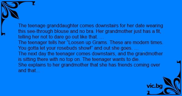 The teenage granddaughter comes downstairs for her date wearing this see-through blouse and no вrа. Her grandmother just has a fit, telling her not to dare go out like that. …