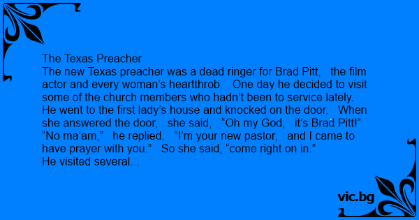 The new Texas preacher was a dead ringer for Brad Pitt, the film actor and every woman’s heartthrob. One day he decided to visit some of the church members who hadn’t been to service lately.