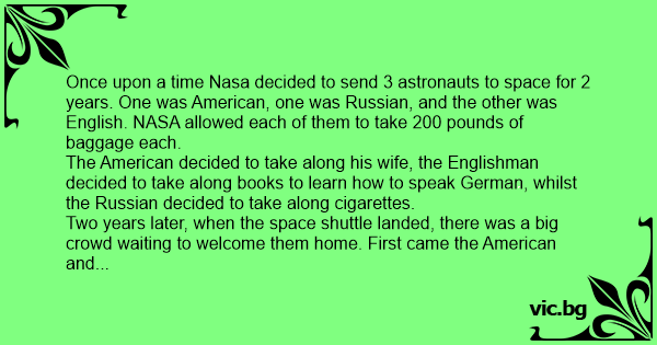 Once upon a time Nasa decided to send 3 astronauts to space for 2 years. One was American, one was Russian, and the other was English. NASA allowed each of them to take 200 pounds of baggage each.