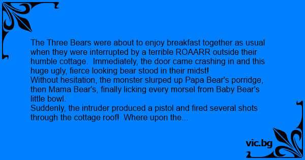 The Three Bears were about to enjoy breakfast together as usual when they were interrupted by a terrible ROAARR outside their humble cottage. Immediately, the door came crashing in and this huge ugly, fierce looking bear stood in their midst!