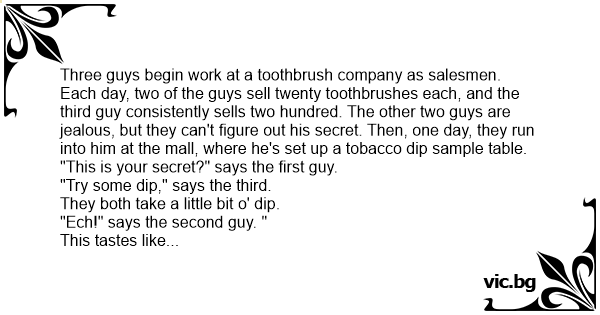 Each day, two of the guys sell twenty toothbrushes each, and the third guy consistently sells two hundred. The other two guys are jealous, but they can't figure out his secret. Then, one day, they run into him at the mall, where he's set up a tobacco dip sample table.