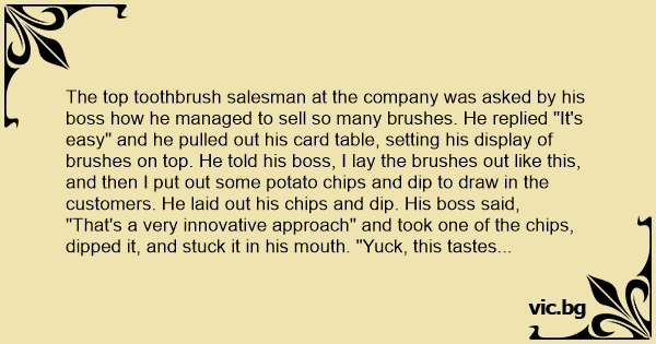 The top toothbrush salesman at the company was asked by his boss how he managed to sell so many brushes. He replied "It's easy" and he pulled out his card table, setting his display of brushes on top. He told his boss, I lay the brushes out like this, and then I put out some potato сhiрs and dip to draw in the customers. He laid out his сhiрs and dip. His boss said,