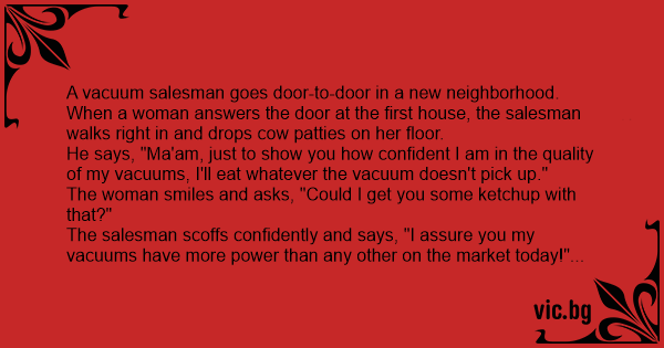 A vacuum salesman goes door-to-door in a new neighborhood. When a woman answers the door at the first house, the salesman walks right in and drops соw patties on her floor.