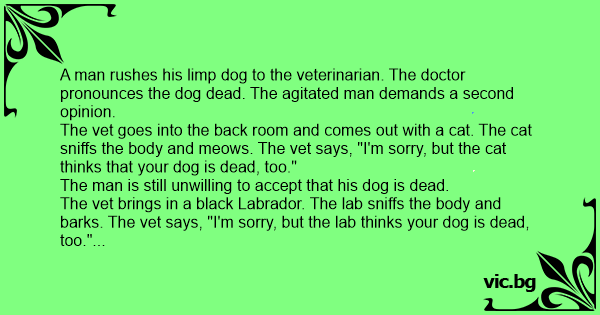 The vet brings in a black Labrador. The lab sniffs the body and barks. The vet says, "I'm sorry, but the lab thinks your dog is dead, too."