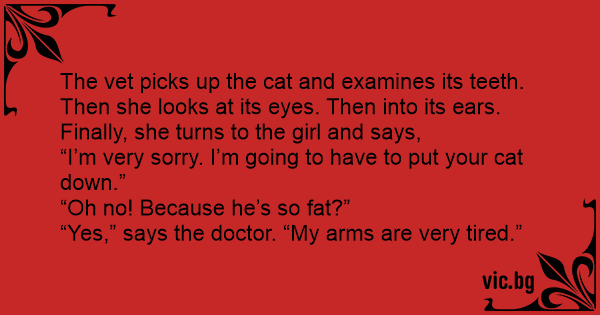 The vet picks up the cat and examines its teeth. Then she looks at its eyes. Then into its ears. Finally, she turns to the girl and says,