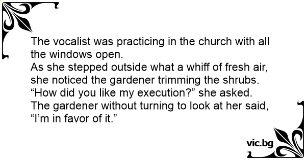 As she stepped outside what a whiff of fresh air, she noticed the gardener trimming the shrubs. “How did you like my execution?” she asked.
