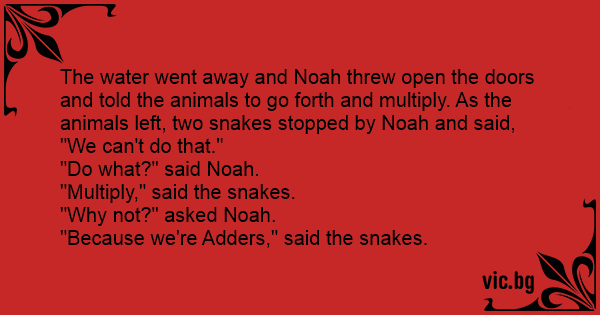 The water went away and Noah threw open the doors and told the animals to go forth and multiply. As the animals left, two snakes stopped by Noah and said,