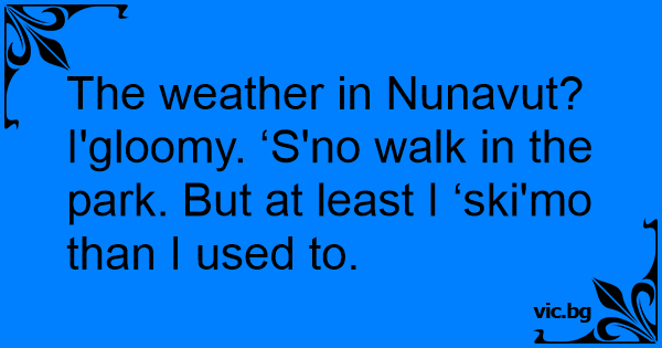The weather in Nunavut? I'gloomy. ‘S'no walk in the park. But at least I ‘ski'mo than I used to.