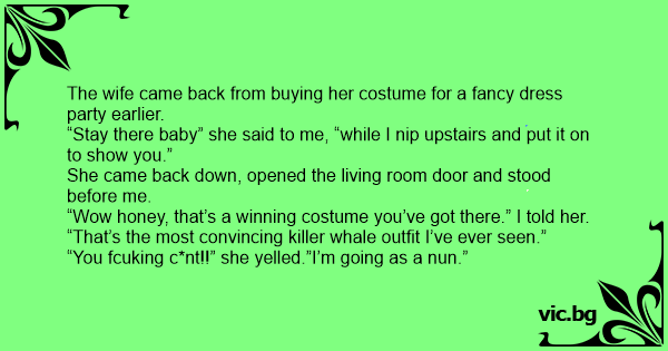 The wife came back from buying her costume for a fancy dress party earlier.