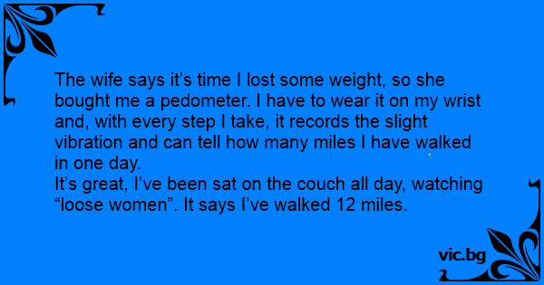 The wife says it’s time I lost some weight, so she bought me a pedometer. I have to wear it on my wrist and, with every step I take, it records the slight vibration and can tell how many miles I have walked in one day.