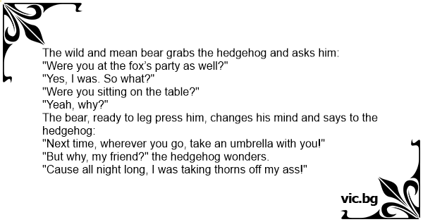 The bear, ready to leg press him, changes his mind and says to the hedgehog: